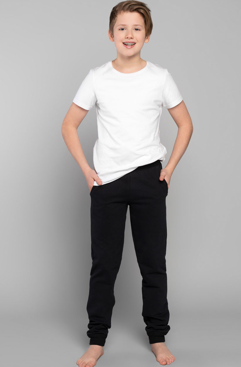 - chlapecké tepláky. Domácí kalhoty pro chlapce. Dvě kapsy na bocích jsou olemované vroubkovým lemem. V pase širší guma, která je všitá ve vroubkovém - elastickém lemu. Dole je elastický vroubkový lem. Velmi kvalitní bavlněný výrobek od Italian Fashion.