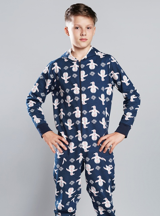 - chlapecký overal s dlouhým rukávem a kapucí. Na bocích dvě boční kapsy. Potisk tučňáků po celém overalu. Zapínání na zip, elastický lem okolo rukávů a kalhot. Krásný měkký bavlněný materiál. Výrobce Italian Fashion.