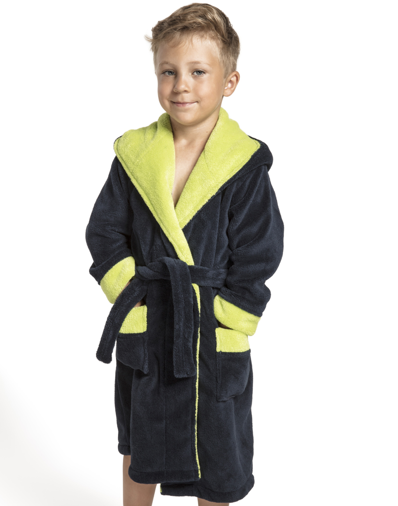 - chlapecký župan s dlouhým rukávem a kapucí, dvě kapsy na bocích, zavazování na pásek v přední části, v zadní části je široká guma. Měkoučký materiál, lemování modrošedou modrou barvou na kapsách, rukávech a v kapuci. Délka ke kolenům.