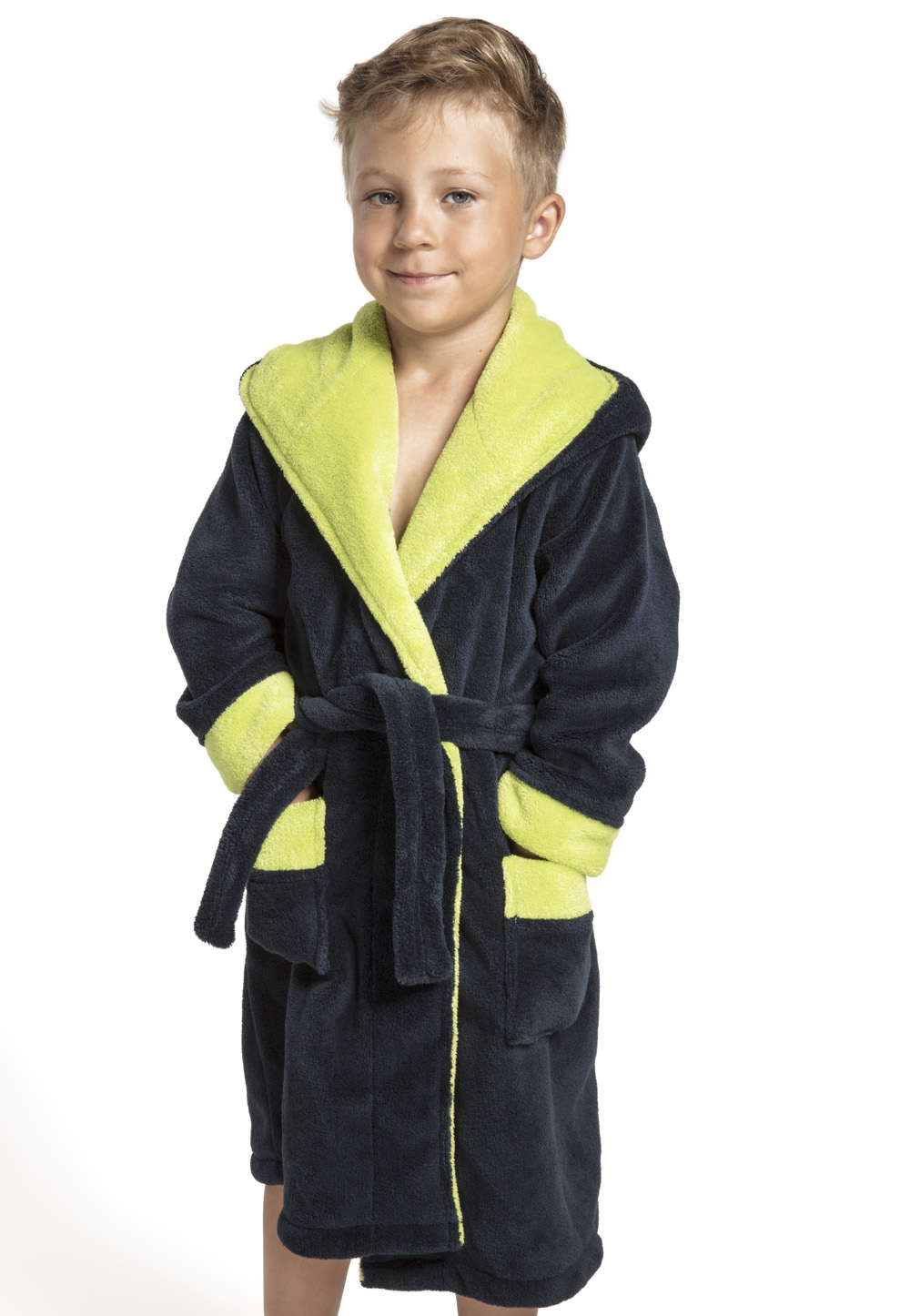 - chlapecký župan s dlouhým rukávem a kapucí, dvě kapsy na bocích, zavazování na pásek v přední části, v zadní části je široká guma. Měkoučký materiál, lemování jasně žlutozelenou barvou na kapsách, rukávech a v kapuci. Lemování s liší podle vybrané barvy. Délka ke kolenům.