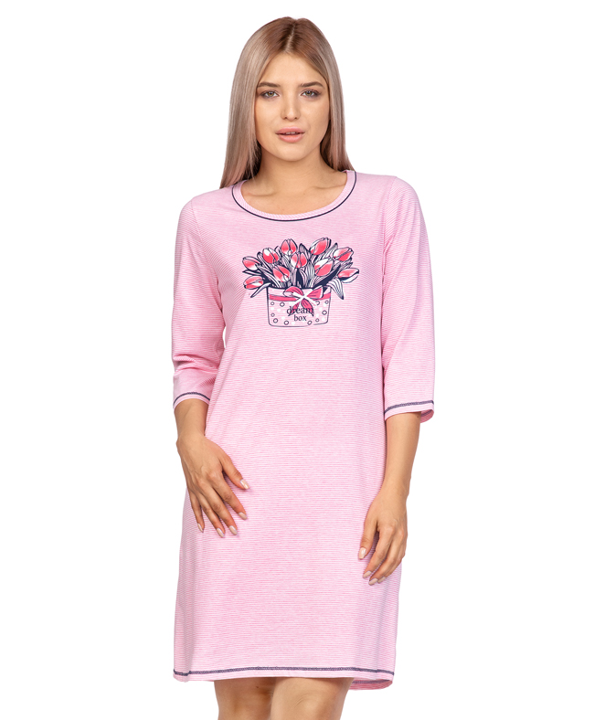 - dámská noční košile s 3/4 rukávem. Výstřih do kulata je olemován tenkým lemem. Celá košilka má jemný proužek. Na přední straně je obrázek kytice květiny. Kontrastní prošítí na rukávech a ve spodní části košilky. Délka nad kolena. Kvalitní bavlněný materiál. Výrobce Regina.