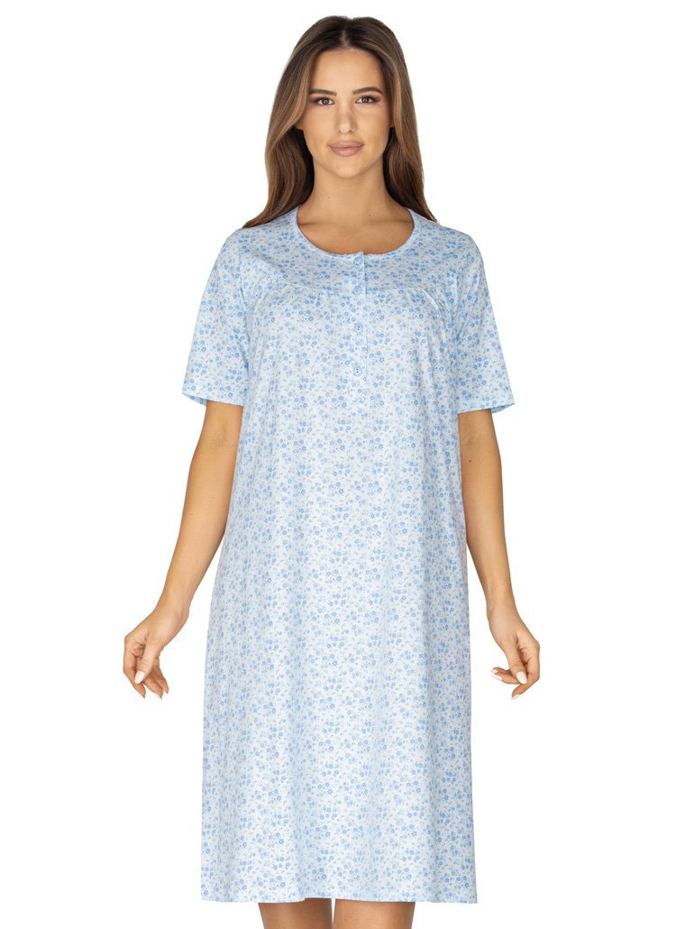 - dámská noční košile s krátkým rukávem. Výstřih do kulata je zakončen knoflíkovou légou. Mírné řasení okolo přední vsadky. Volnější střih zaručí pohodlnost noční košile. Drobné kytičky po celé košilce. Délka pod kolena. Kvalitní bavlněný materiál. Výrobce Regina.