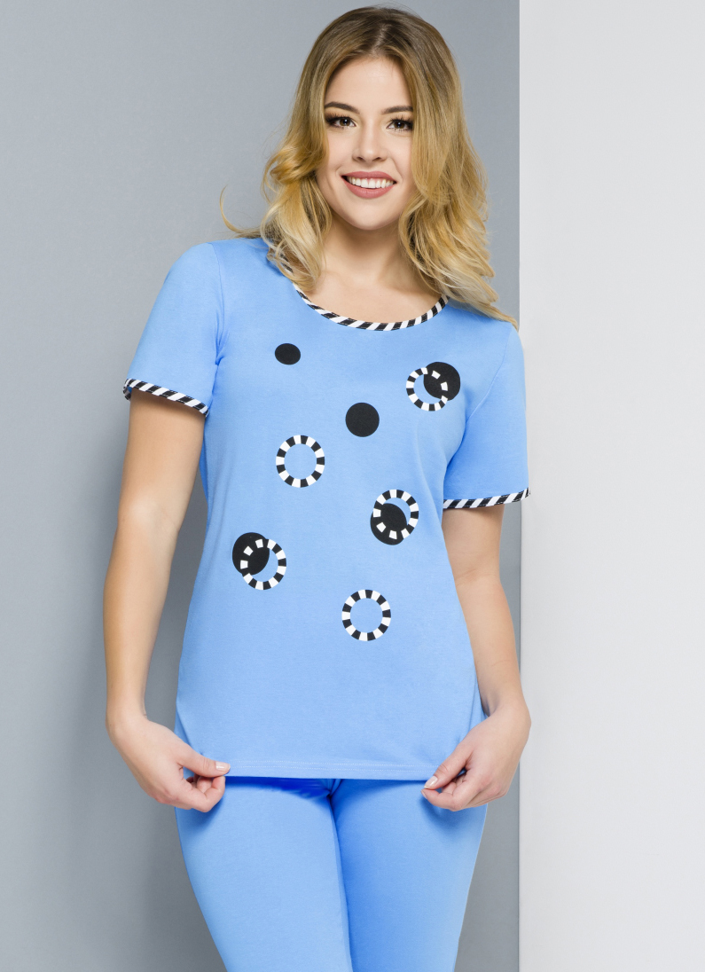 - dámské pyžamo s krátkým rukávem. Vrchní díl s kulatým výstřihem, olemování proužkovou látkou okolo výstřihu a rukávů. Kalhoty 3/4, jednobarevné, v pase do gumy. Kvalitní bavlněný materiál, výrobce Regina.