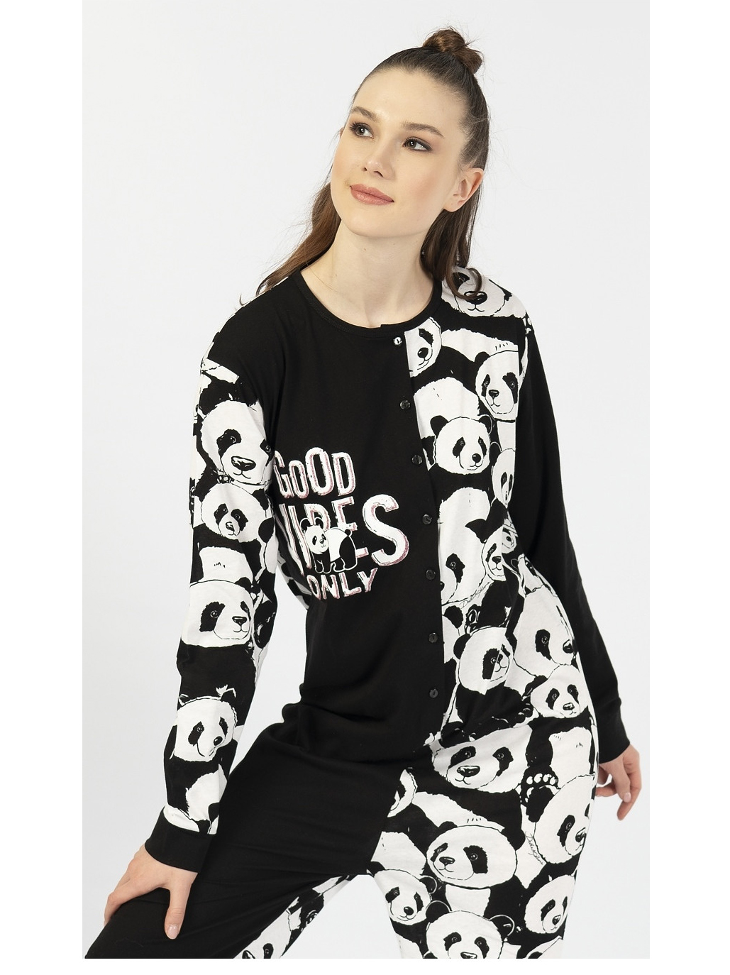 - dámský overal na spaní s dlouhým rukávem, rozepínání overalu na knoflíčky, rukávy zakončené lemem, kalhoty zakončené lemem. Medvídci panda po 1/2 overalu, na druhé 1/2 je nápis. Bavlněný materiál. Pro holčičky máma stejný overal Pandy. Výrobce Vienetta Secret.