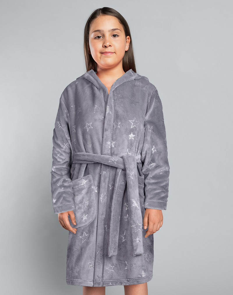- dívčí župan s dlouhým rukávem a kapucí, dvě kapsy na bocích. Nádherný potisk lesklých hvězdiček po celém župánku. Pásek na stáhnutí. Teplý, měkoučký materiál. Pro maminky máme stejný župan Arte. Délka ke kolenům.