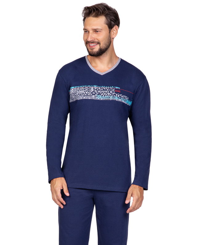 - pánské pyžamo s dlouhým rukávem, výstřih do V, který je olemován kontrastní látkou. Na přední straně ozdobný nápis. Kalhoty dlouhé, jednobarevné, v pase do gumy. Velmi kvalitní materiál. Výrobce Regina.