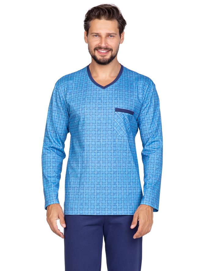 - pánské pyžamo s dlouhým rukávem, výstřih do V, který je olemován kontrastní látkou. Malá kapsička je olemována. Potisk kárečka na vrchním díle. Kalhoty dlouhé, jednobarevné, v pase do gumy. Velmi kvalitní materiál. Výrobce Regina.