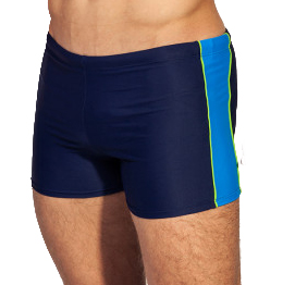 pánské šortky, podšité, na bocích ozdobné tenké lemy ref. žluté barvy, vsuvka jasně modrá,  středový šev. Podšívka je v přední části.  Plavky jsou z materiálu Malaga.