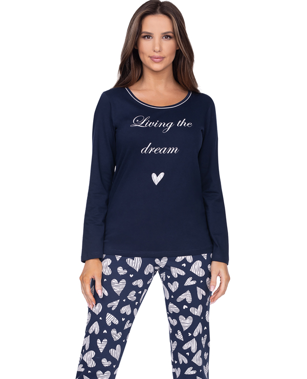 - dámské pyžamo s dlouhým rukávem a dlouhými kalhotami. Výstřih do kulata je olemován tenkým lemem. Srdíček s nápisem na přední straně. Kalhoty s potisky srdíček, dlouhé, v pase do gumy. Výrobce: Regina