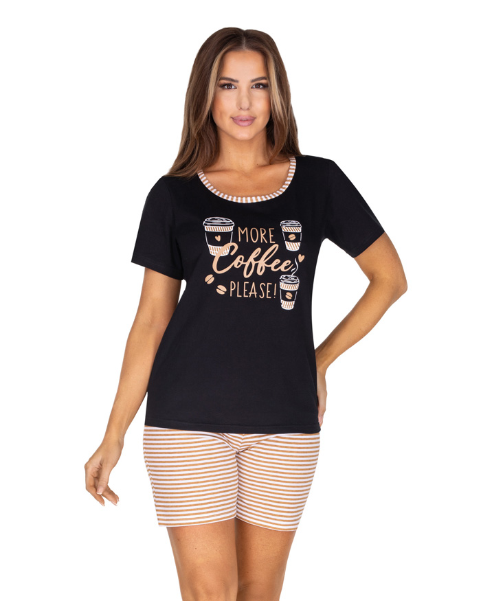 - dámské pyžamo s krátkým rukávem a kraťasy. Výstřih do kulata je olemován látkou, které je na kraťasech. V přední části obrázek kávičky s nápisem. Kraťasy s proužkem, v pase do gumy. Kvalitní bavlněný materiál, výrobce Regina.
