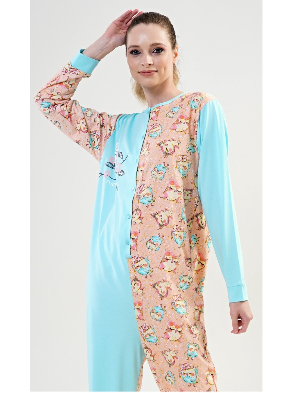 - dámský overal na spaní s dlouhým rukávem, rozepínání overalu na knoflíčky, rukávy zakončené lemem, kalhoty zakončené lemem. Potisk soviček na 1/2 overalu na druhé 1/2 jeden větší obrázek sovy. Nádherná barevná kombinace. Bavlněný materiál - tenčí. Pro holčičky máme stejný overal Sovičky. Výrobce Vienetta Secret.