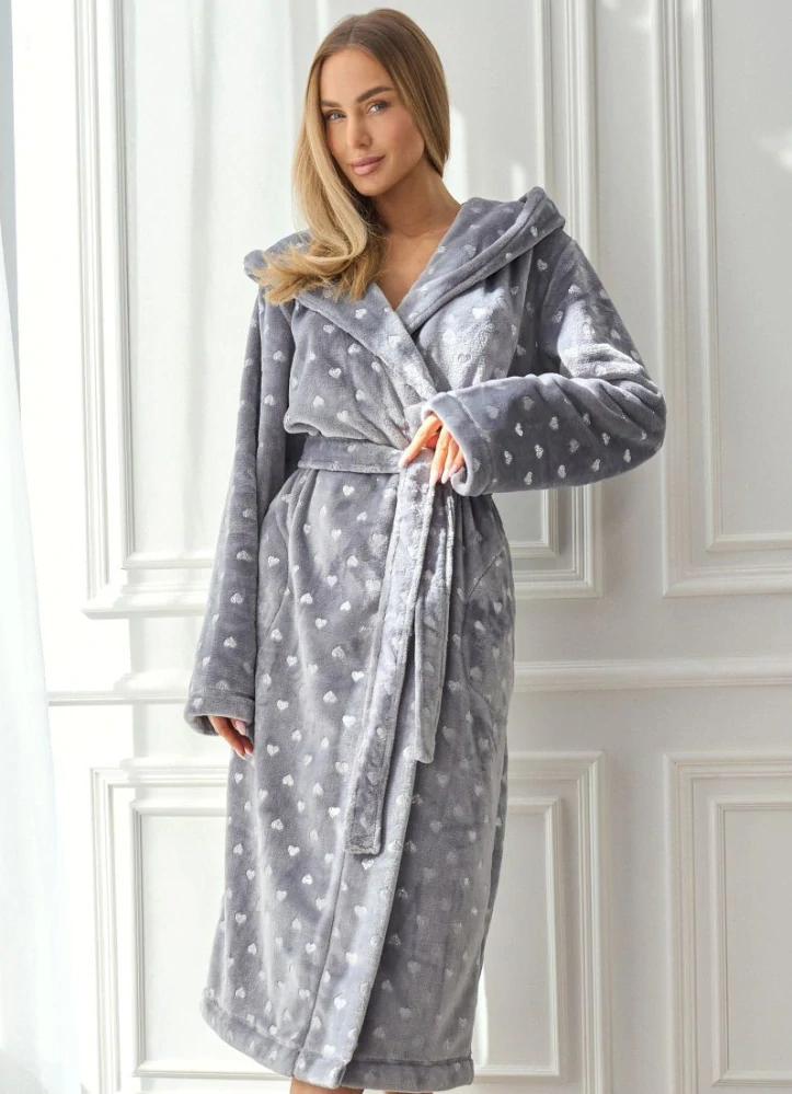 dámský župan dlouhý je zdobený okouzlujícími lesklými srdíčky. Je ztělesněním pohodlí, ženskosti a elegantní relaxace. Je vyroben z měkkého, vysoce kvalitního plyšového materiálu a poskytuje příjemné teplo za chladných rán a večerů.