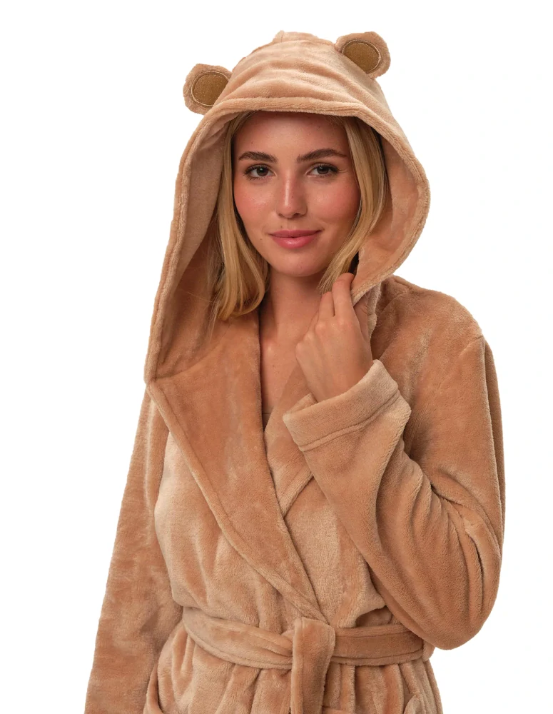 - dámský župan s kapucí, délka nad kolena. Župan s kapucí. Kapuce je ozdobená dvěma ouškama se třpytivým efektem. Na bocích jsou dvě kapsy. Pásek na stažení. Měkoučký a hebký materiál, který je příjemný na nošení. Krásný a teplý materiál, jemný na dotek, ve které se budete cítit celý den nádherně.