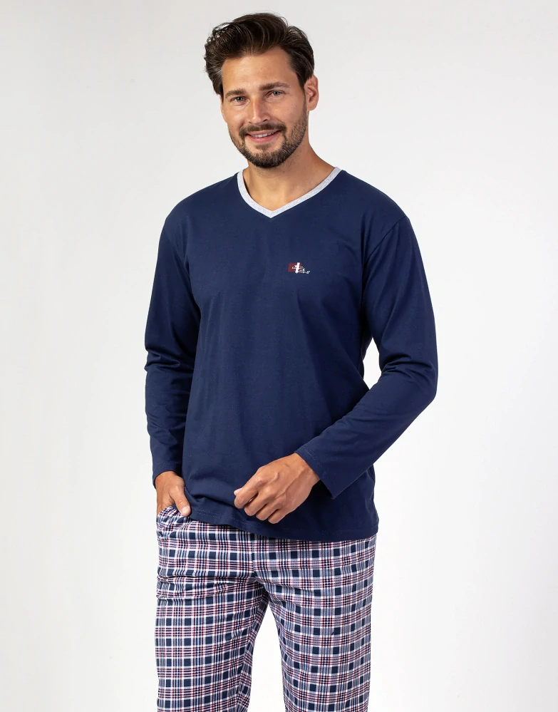 - pánské pyžamo s dlouhým rukávem. Výstřih do V je olemován jednobarevným lemem. Na přední straně malý ozdobný obrázek. Kalhoty dlouhé, kárečkové, v pase do gumy. Velmi kvalitní bavlněný materiál. Výrobce Regina.