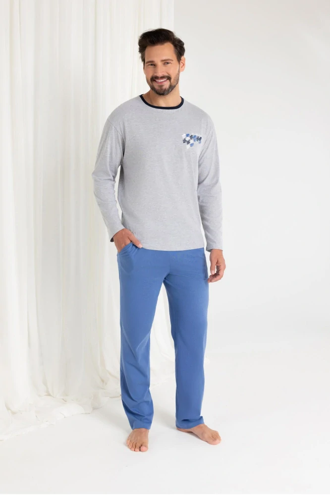 - pánské pyžamo s dlouhým rukávem. Výstřih do kulata je olemován tmavým lemem.  Na přední straně malý ozdobný obrázek.  Kalhoty dlouhé s kapsami, jednobarevné, v pase do gumy.  Velmi kvalitní bavlněný materiál. Výrobce Regina.