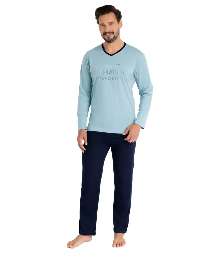 - pánské pyžamo s dlouhým rukávem, výstřih do V je olemován barvou kalhot. Na přední straně ozdobný pás. Kalhoty dlouhé, jednobarevné, v pase do gumy. Velmi kvalitní bavlněný materiál. Výrobce Regina.