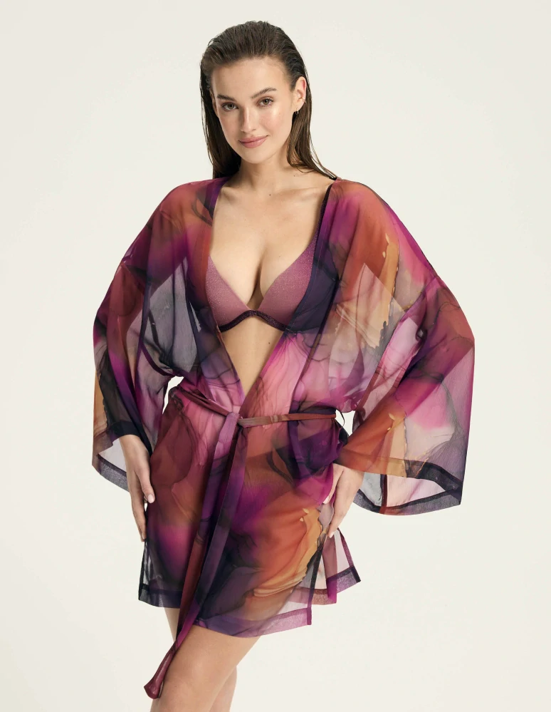 Plážový župan Tango z šifonu se vyznačuje jedinečným malířským potiskem. Je ideální pro zahalení se na pláži nebo u bazénu.